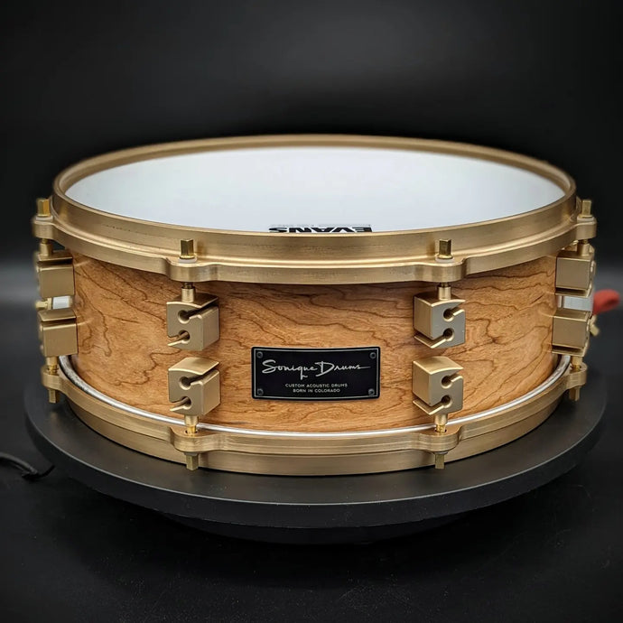 Ryan's setup includes a Sonique Drums 5" x 14" North American Cherry snare with the NATO-1 throw off.