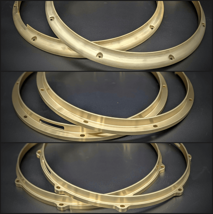 apariencia y desgaste. Nuestros aros de latón están disponibles actualmente en diámetros de 6" a 24". Tanto los aros 'Classic' como 'Heavy AF' están disponibles ahora y nuestros aros exclusivos "S" llegarán más adelante en 2024.